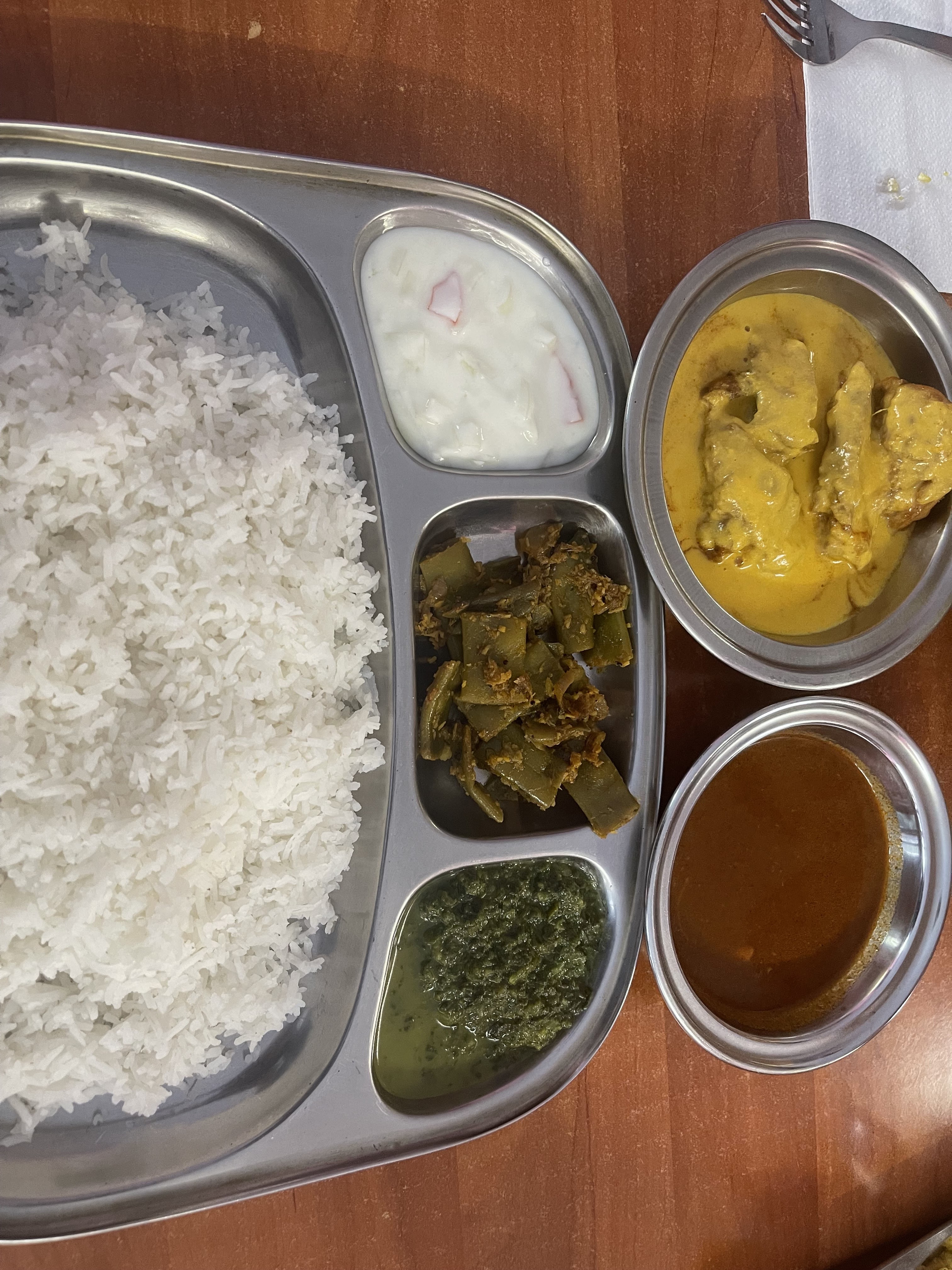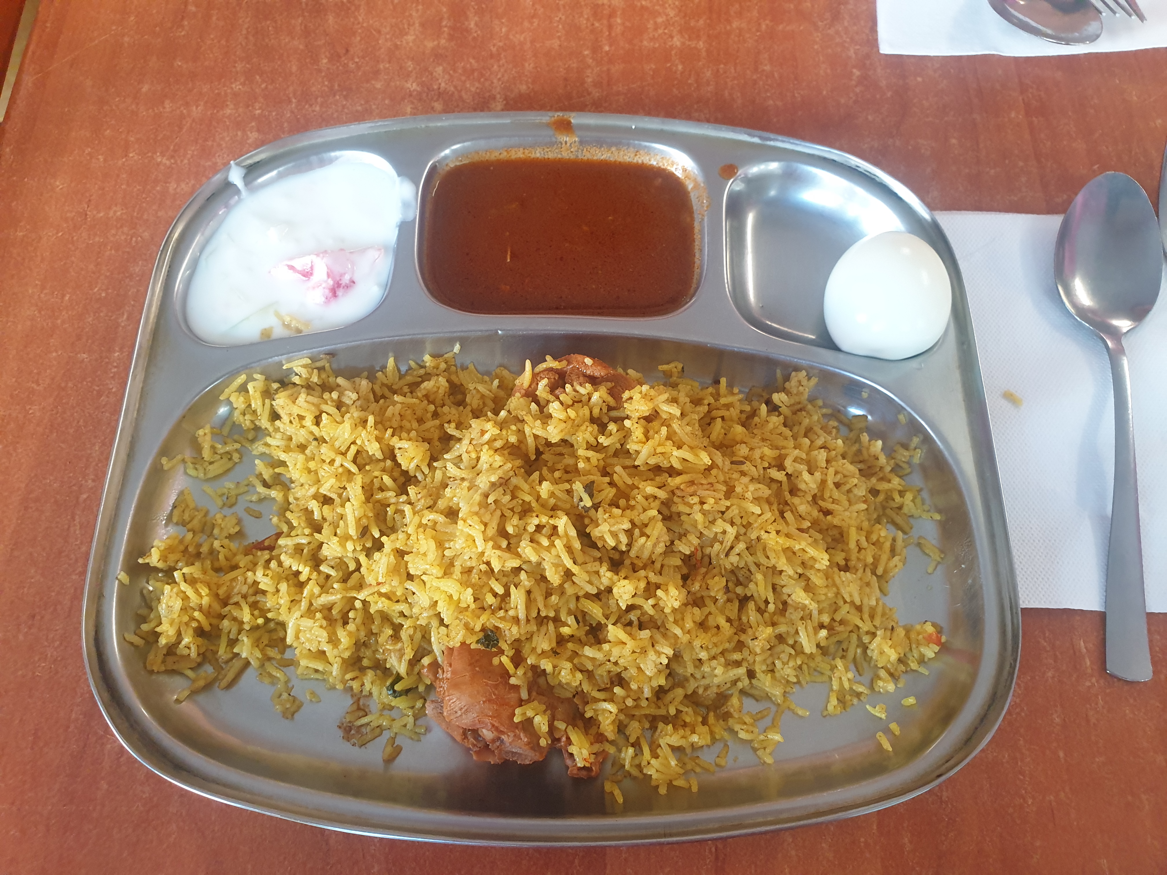 J'ai déjeuné tard ici avec ma mère. Une nourriture délicieuse, en quantité et en goût est fortement recommandée. La dame (patron je crois) est sympathique. L'endroit est très simple. Le sol est collant et les toilettes ne sont pas propres, mais la nourriture est vraiment bonne. Nous avons commandé du poisson au curry et du poulet Biryani. Les prix sont très abordables !