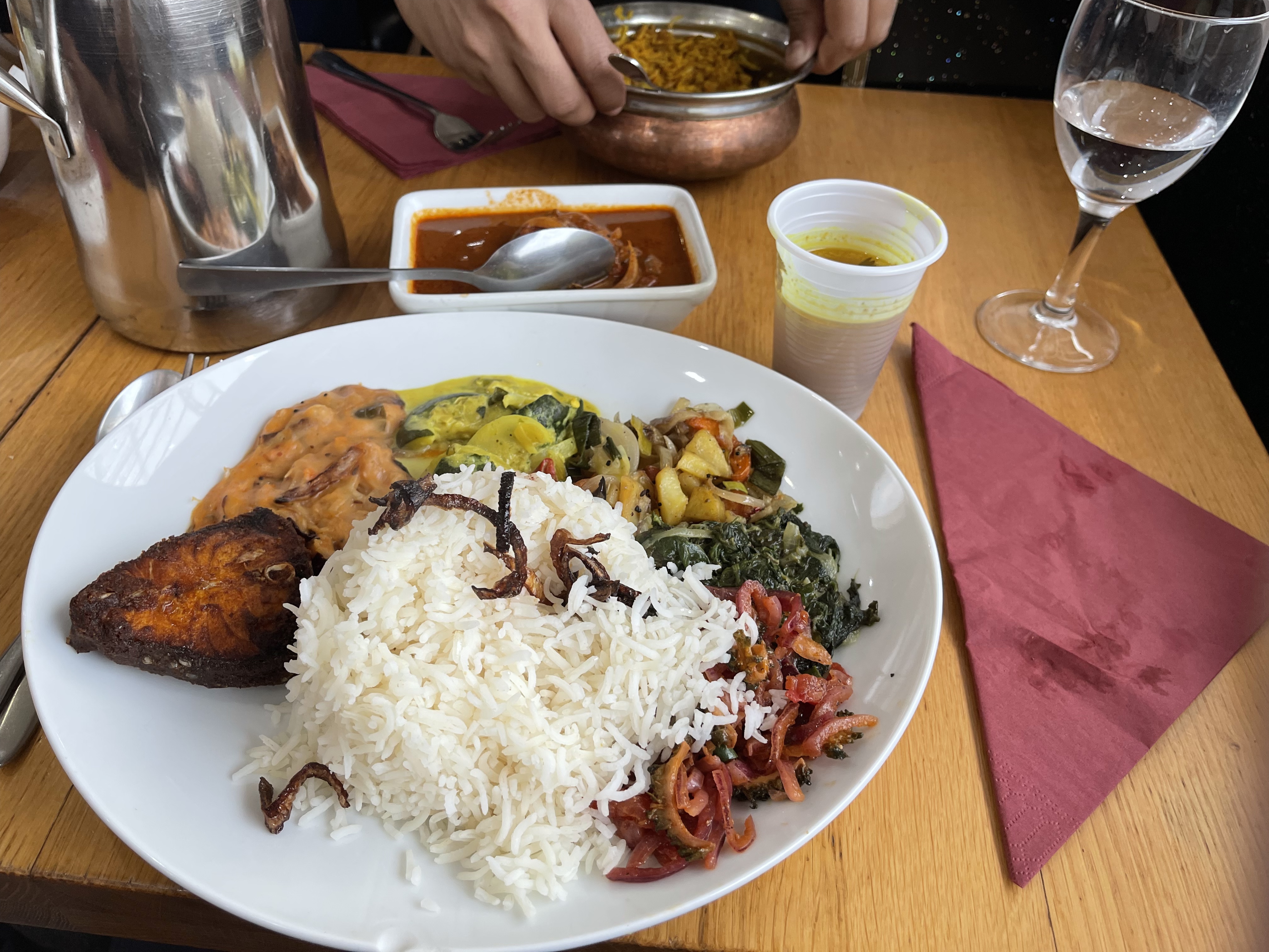 C'était plutôt bon, malheureusement mon ami et moi avons eu des problèmes aux toilettes par la suite. On a pris du lassi à la rose (très bon !), diverses fritures en entrée (des découvertes intéressantes pour les non initiés à la cuisine srilankaise), un Thali légumes (intéressant, plus que ce n'était bon) et un biryani (très bon !)